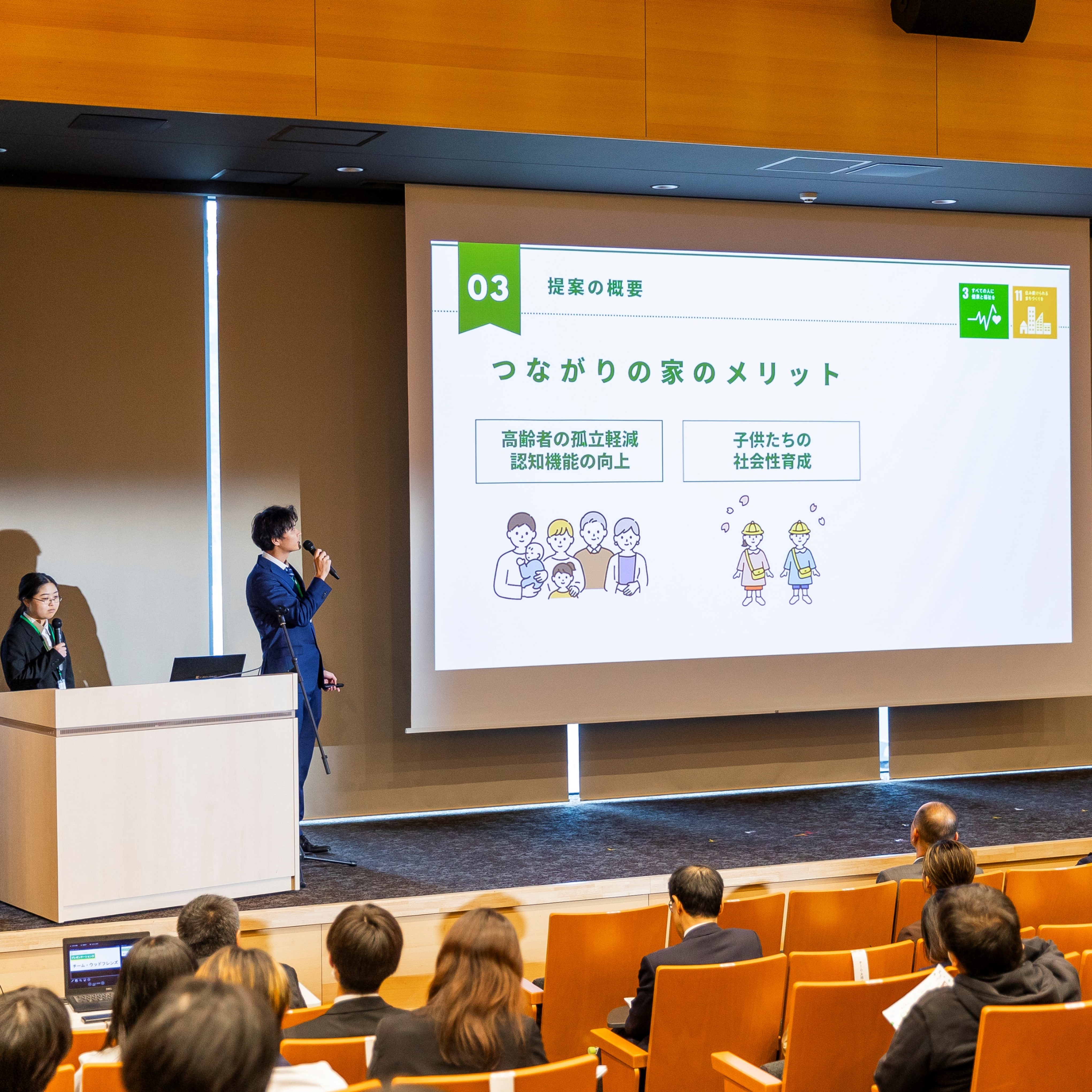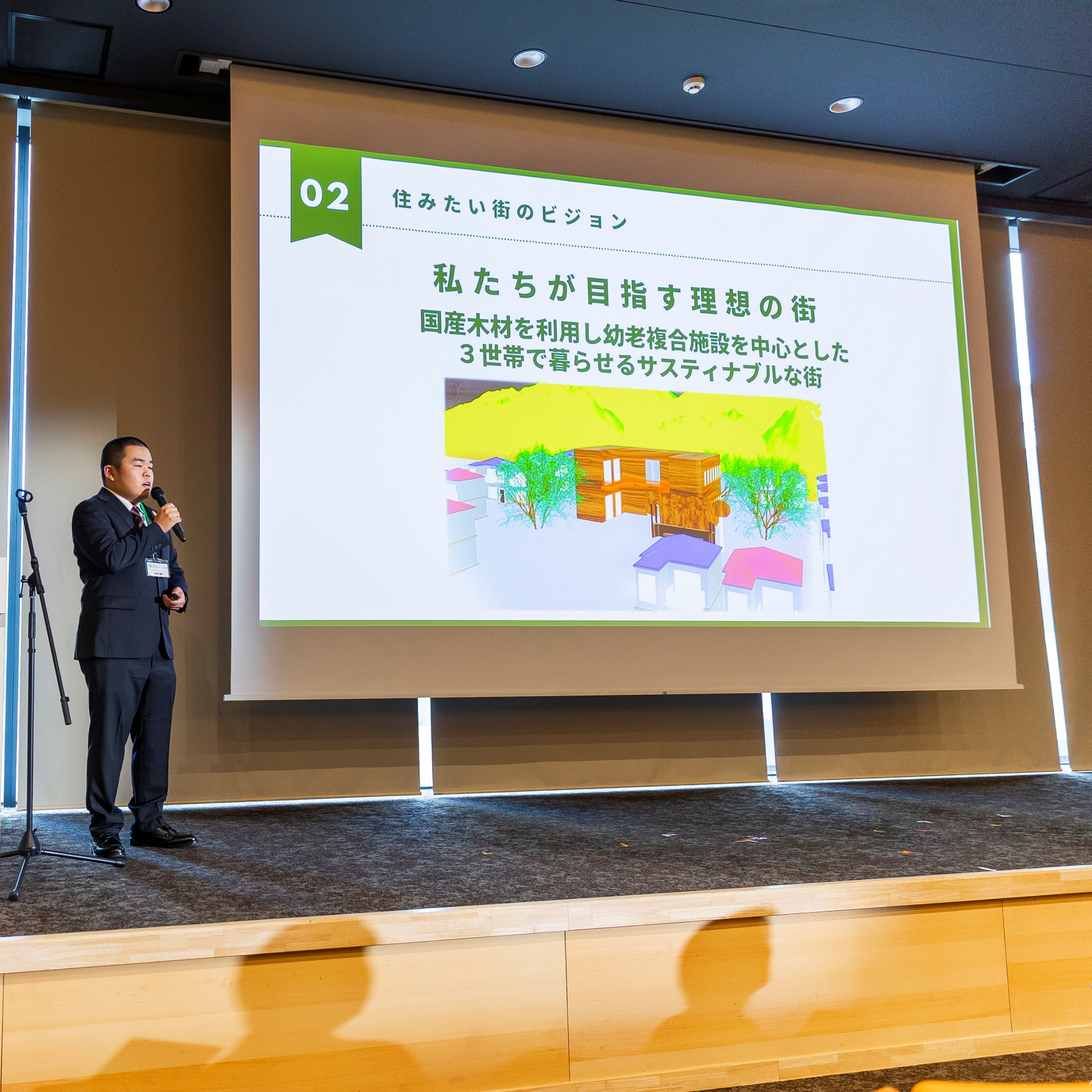 高齢化や晩婚化が進む現在、子育てをしながら親の介護もしなければならない未来が来ると考え、この社会問題と、生物多様性の保全や気候変動に配慮し、国産木材で作られた幼老複合施設や子育てのしやすい住宅のあるサステナブルな街を作る提案となりました。